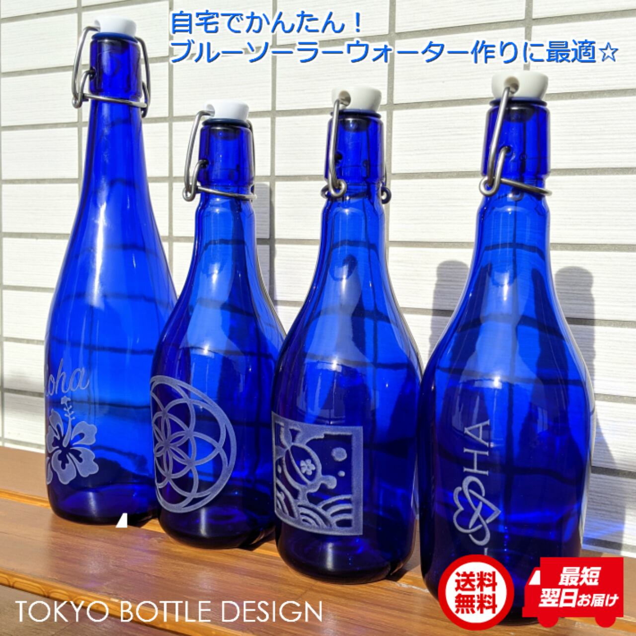 一般的に販売されているブルーボトルとは異なり、私たちのブルーボトルには、意図をもった「シンボル」が刻まれています。これは、サンドブラスティング加工という特殊な技術で、専門の職人が一本一本丁寧に刻印しています。「シンボル」は10種類以上あり、「生命」「愛」「パワー」など、それぞれ固有の意図をもっています。