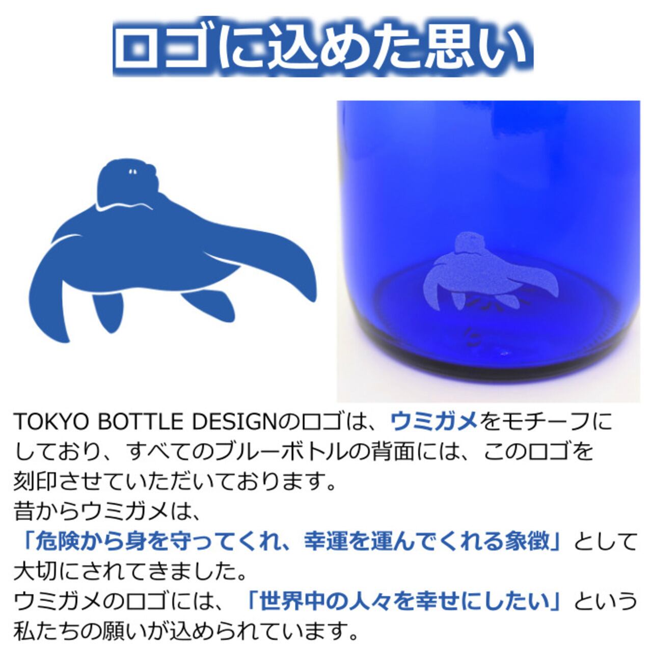 ブルーボトルとは、その名前の通り、青いガラス瓶のことです。私たちTOKYO BOTTLE DESIGNが製造・販売するブルーボトルは、「人も環境も癒す水」をコンセプトに、水の持つ特性を最大限に活かしながら、地球環境の改善にも貢献することを目的として開発されました。