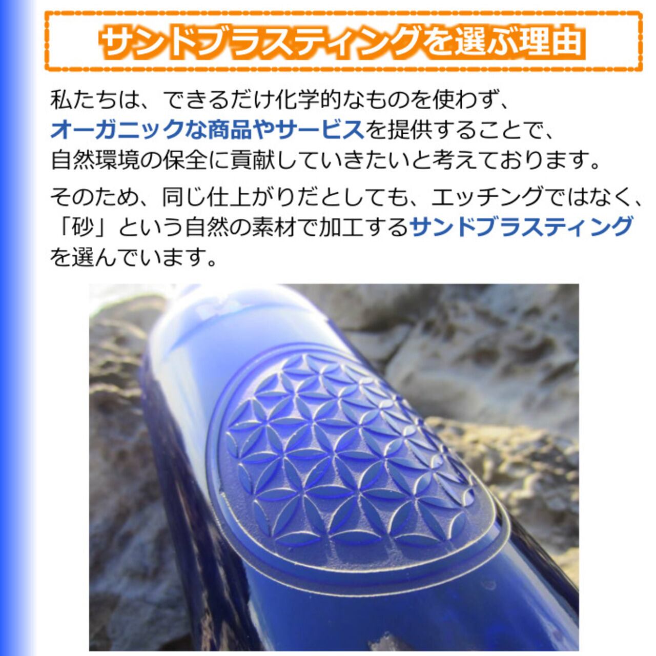 一般的に販売されているブルーボトルとは異なり、私たちのブルーボトルには、意図をもった「シンボル」が刻まれています。これは、サンドブラスティング加工という特殊な技術で、専門の職人が一本一本丁寧に刻印しています。「シンボル」は10種類以上あり、「生命」「愛」「パワー」など、それぞれ固有の意図をもっています。