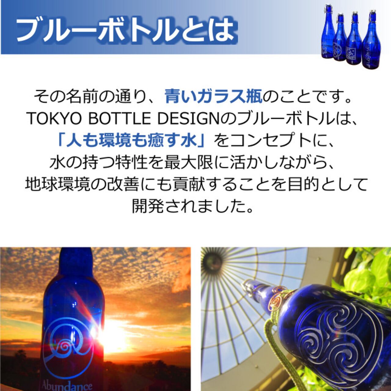 ブルーボトルとは、その名前の通り、青いガラス瓶のことです。私たちTOKYO BOTTLE DESIGNが製造・販売するブルーボトルは、「人も環境も癒す水」をコンセプトに、水の持つ特性を最大限に活かしながら、地球環境の改善にも貢献することを目的として開発されました。